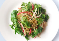 🥢春菊の中華風キラキラサラダ (開発者: 水野優子さん) 旬の春菊と鮮やかな紅芯ダイコンが主役!中華風の味付けに、「キラキラ海藻素材」を組み合わせて、見た目の美しさと楽しいプチプチ食感がたまらない一品!もう、普通のサラダとは言わせません!🤩